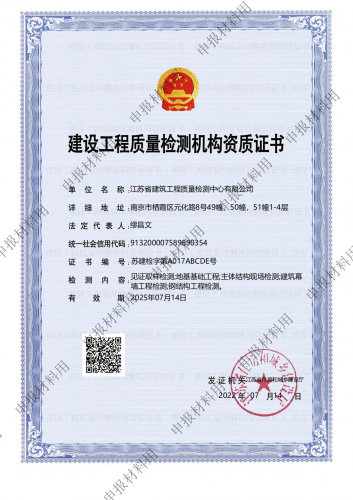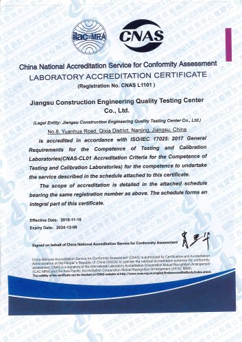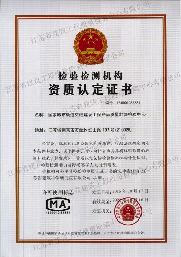 國家城市軌道交通建設工程產(chǎn)品質量監(jiān)督檢驗中心, 依托江蘇省建筑科學研究院和江蘇省建筑工程質量檢測中心在城市軌道交通建設工程領域的綜合技術優(yōu)勢,于2016年10月獲得國家認證認可監(jiān)督委員會批準授權..